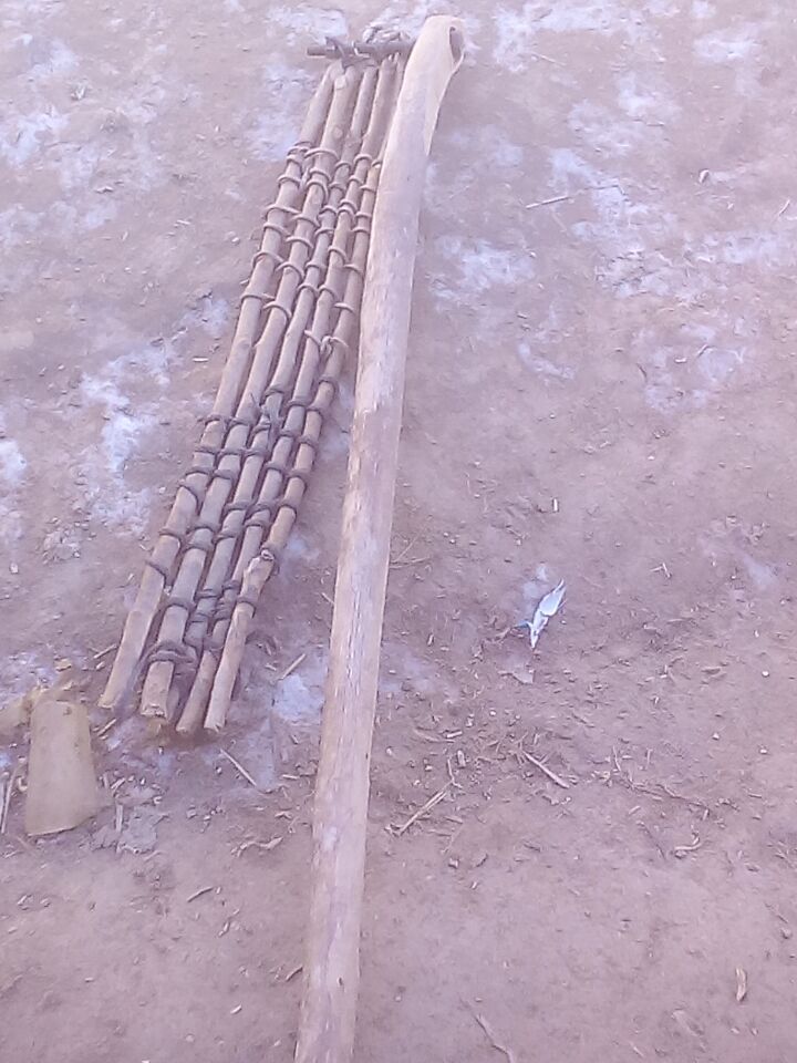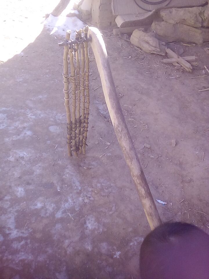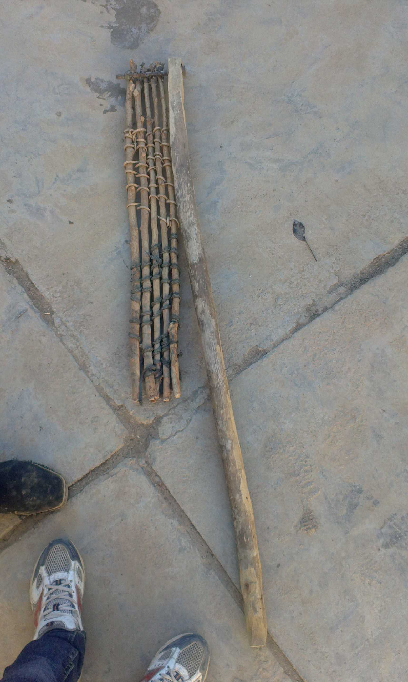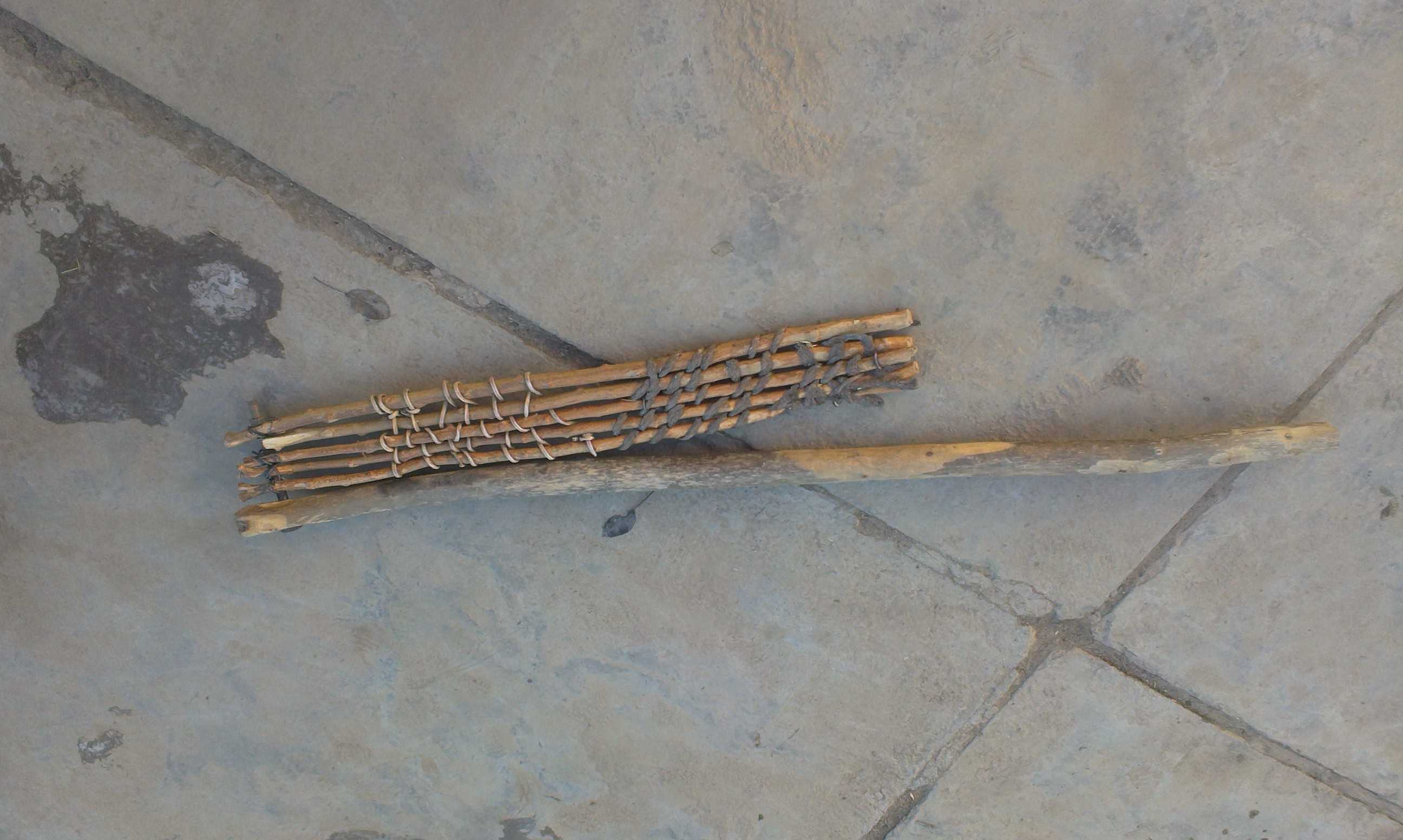他的工作远离很简单,就像鞭子一样,只是鞭子软的那一部分成了两根胳膊粗的木棒。鞭子后面的那个部分成了一根比较长的木棒。他们中间用一截断绳连接。所以能够摔得更有劲。