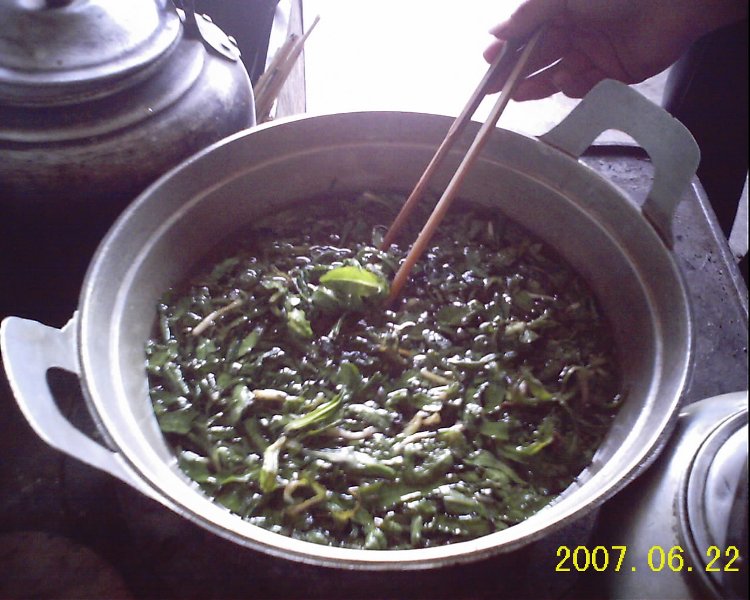 把菜先放在清水中淘洗干净,再摘去其中杂草,然后放入锅中煮一段时间,再捞出来捏干水放入盘中,在勺中倒少许的清油等油过后,倒入菜中并搅拌。