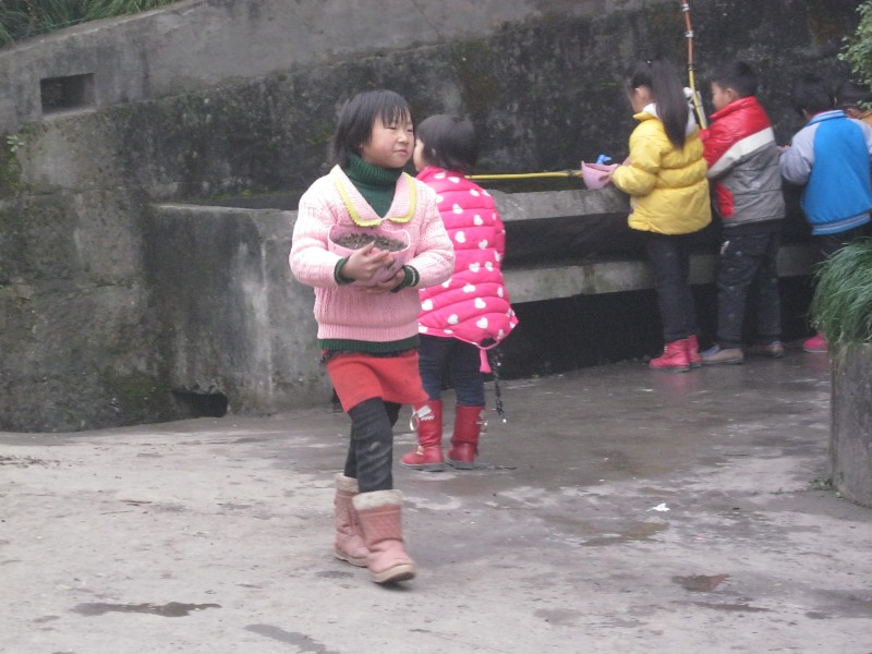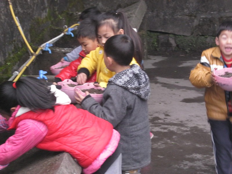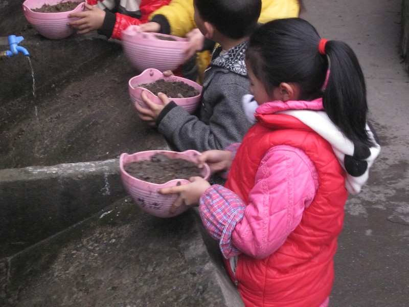 看了一会才知道:原来由于好久没有下雨了,他们把自己班上种的花盆搬到水笼头前开始江水了。