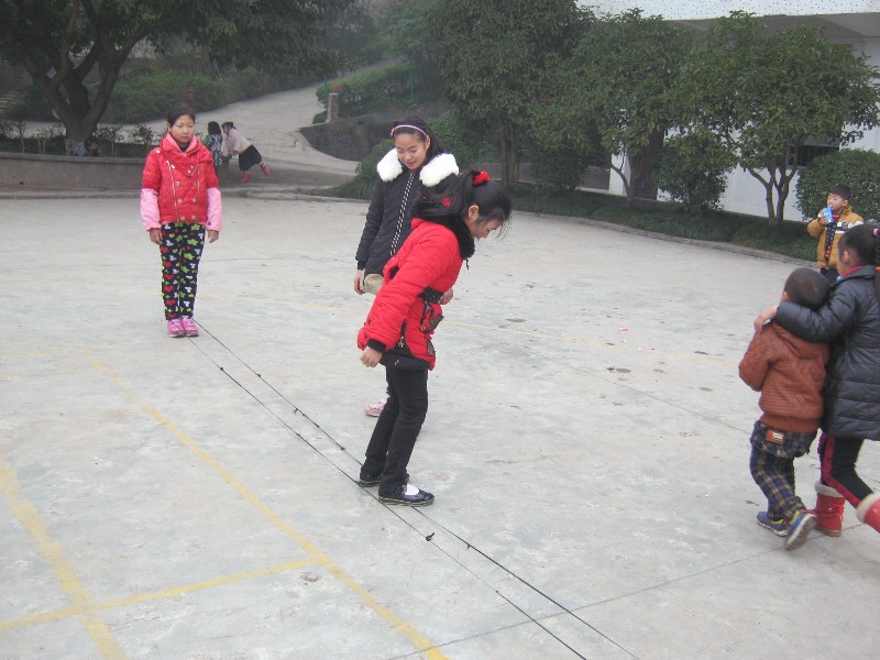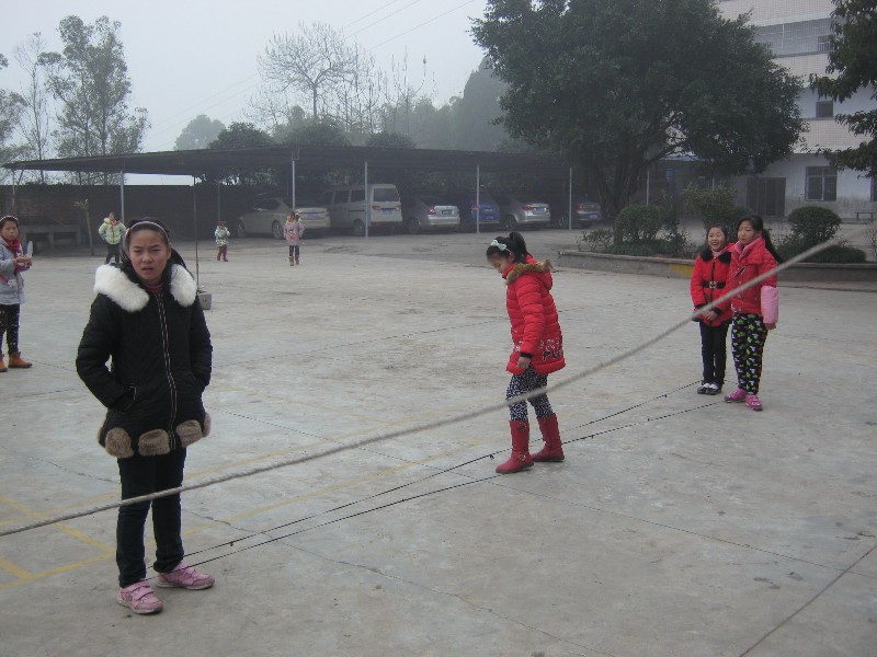 我们几个在一边玩着,你看一年级的小弟小妹们也不甘落后,他们也有十来个同学正在进行跳长绳呢,我希望我们同学在平时多练习,冬季运动会都能取得好成绩。