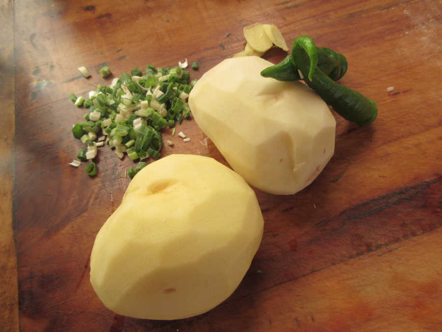 开工了,外祖母先准备食才,有那长得"肥肥壮壮"的小土豆们,绿油油的葱花,令人望而生威的青椒,还有一些黄色的小姜片。外祖母做着那些最简单的工序,洗菜、切菜。