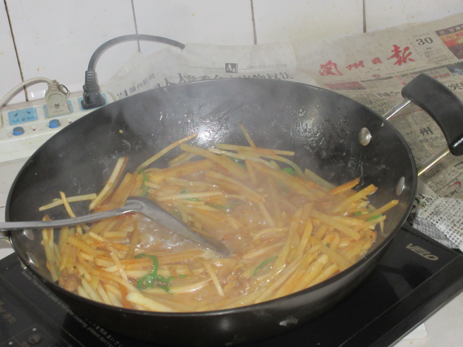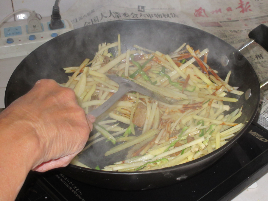 简单的工序完成,外祖母要大显身手了。在锅中加上一点儿植物油,等油完全就过以后在里面加入一些肉片后倒入土豆丝,进行翻炒,一会儿后再加入切好的青椒丝和姜片儿,之后加入适量的酱油和各种的调味品,继续翻炒,同时在翻炒的过程中要加入一些热水,这样做出的炒菜更加的脍炙人口,最后在加入绿油油的葱花后便可以盛到盘子里面了。 看着这盘美味可口的佳肴,我的口水"飞流直下三千尺",外祖母看到我那样子笑了,说:"快把大家叫来吃吧,快去!"