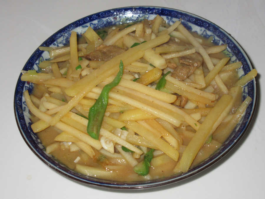 在我的记忆之中,我曾在那个盛产土豆的地乡——定西,吃到我外祖母做得一道家乡菜,便是青椒土豆丝。我记得我小时候曾经为了这道美味的佳肴而哭着闹着要在外祖母家多待几日不可。