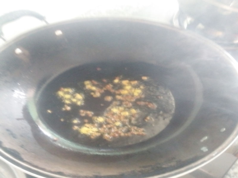 然后倒油把油预热放入蒜、姜。炒出香味就可以开始炒了。
