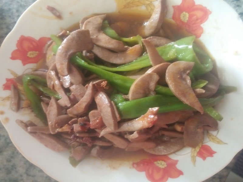 再放入腰子在锅中爆炒,吵得要输的时候放一些辣椒进去。炒一会就可以起锅了。