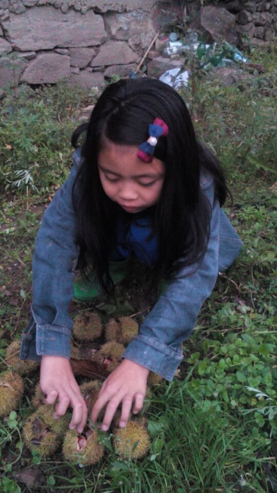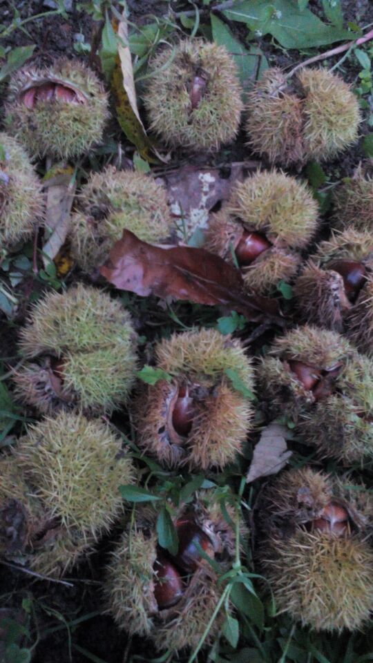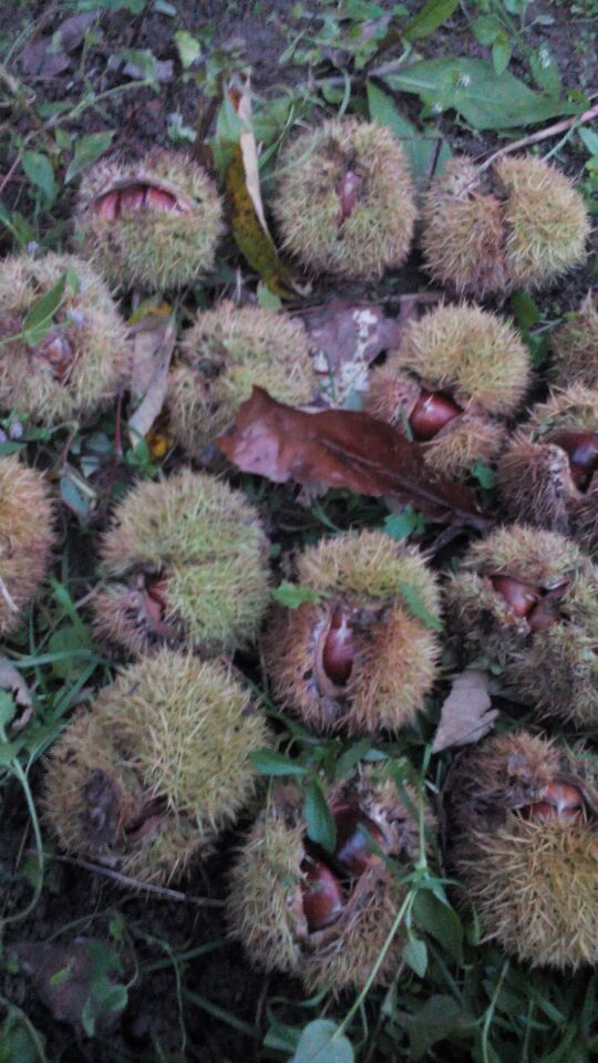 走了大约十五分钟的时间,我来到了板栗树林,地上有很多板栗,还这种浑身带着刺的小球。我知道板栗就是从这些小球体里蹦出来的。我先找奔出来的板栗,捡完之后,我找来一根又细又短但很结实的竹竿,然后和脚配合着撬开那些带刺的小球。结果,里面是又胖有大的板栗。