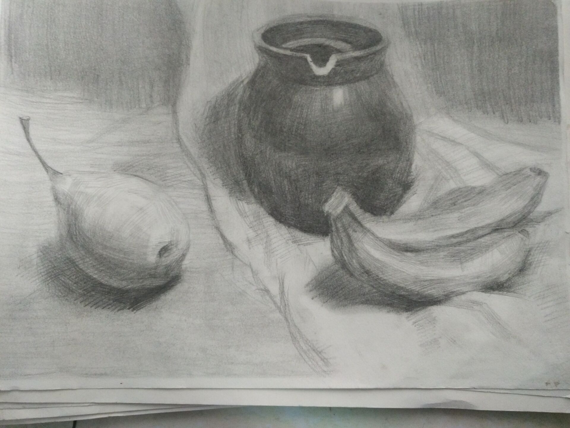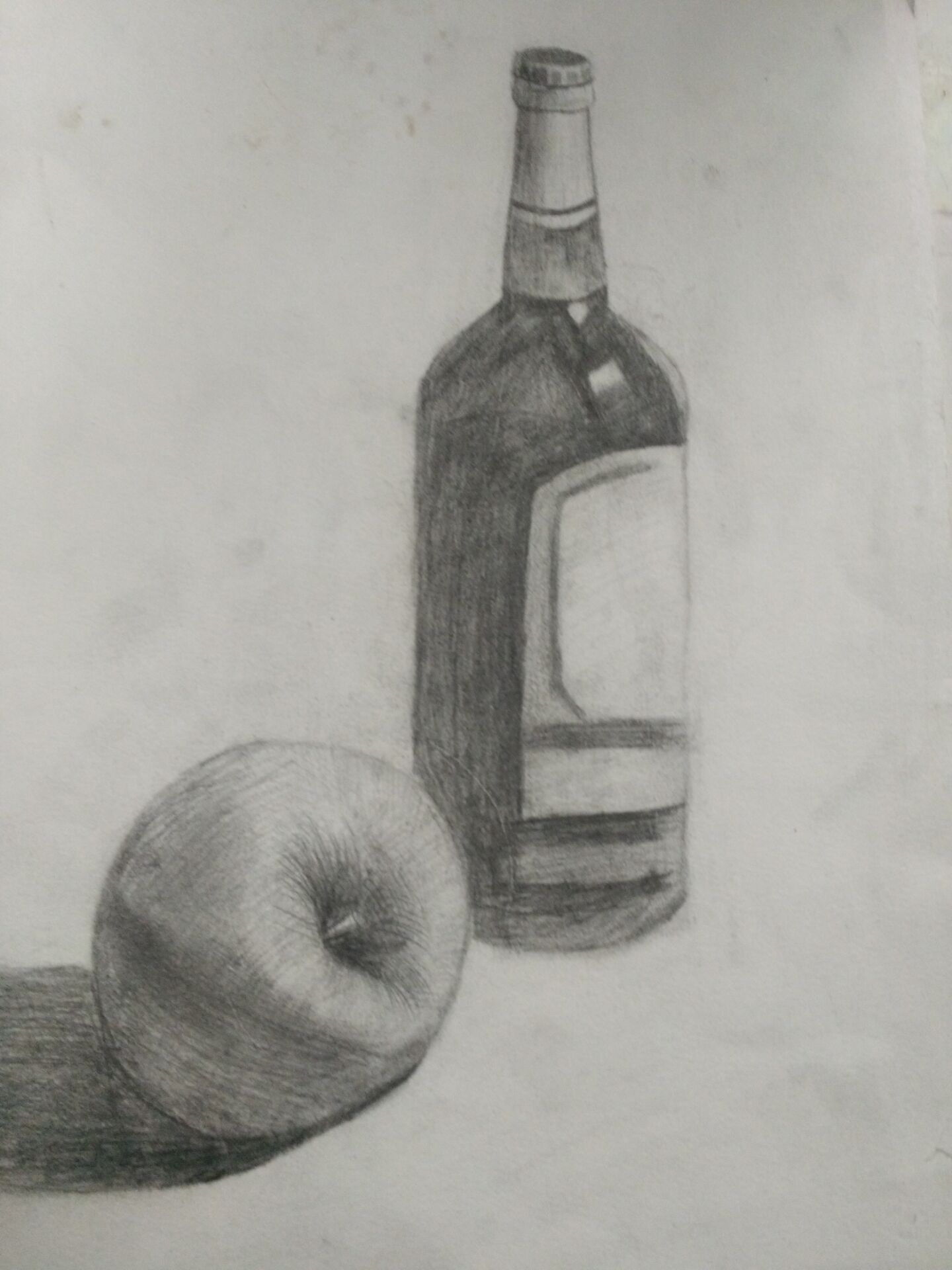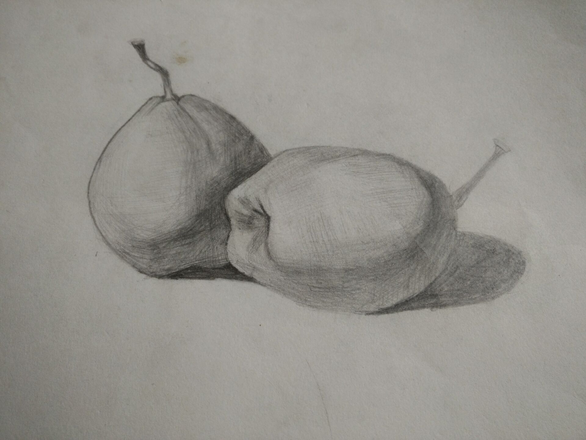 基本图形练习完后自然就开始学画水果了,鸭梨,是我画的第一种水果,虽然画得并不是很好,打形体时,整体就开始向左倾斜。但是对我来说,他的意义非凡,它就是最漂亮的一幅画。