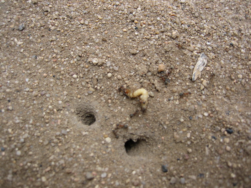 我们把爬在草芽上的"骆驼"扔到了蚂蚁洞口,只见一群蚂蚁便出来了,硬是把"骆驼"拉进了洞里,当然不是请它吃饭,而是把它当作午餐来填饱那些蚂蚁的肚子。