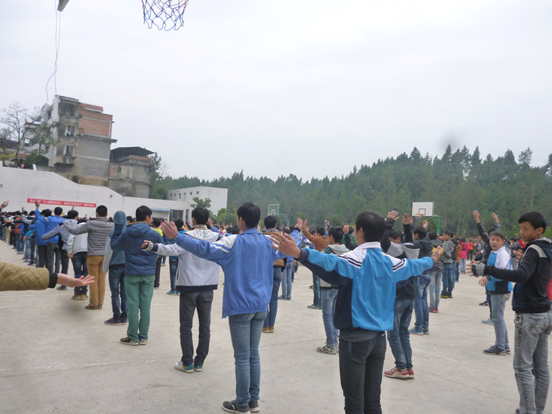 当跑完操,在第二节课下课,那是,休息时间有半小时,所以我们便又在大操场集合做体操。从四年级到九年级,都要做体操,我们列成一个方队,随着体操音乐,我们在温阳下做着体操,偶尔流流汗水,但大家还是开开心心,做体操,没有抱怨,整齐有的序做体操,看着心里也多了一丝畅快。