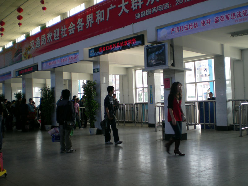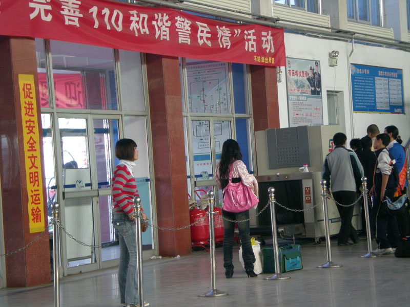 一进门人们都把自已身上带的大包小包放在一个仪器上检查,姑姑说这是个安检仪,只要包里放着危险品,都会被发现。车站里的警察也很多,不时地会有几个巡逻,让我们有一种安全感。