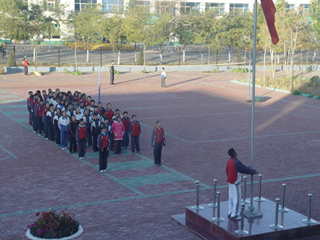 看!我们七(二)班的同学正在升旗。升旗手是杨小雨,他沉着的转动摇把,使五星红旗徐徐上升;接着是护旗手和其他同学,他们笔直的站在那儿,目不转睛的望着冉冉升起的五星红旗,国歌停了,五星红旗也刚好升到了旗杆的最上面。这是一次多么有意义的升旗呀!