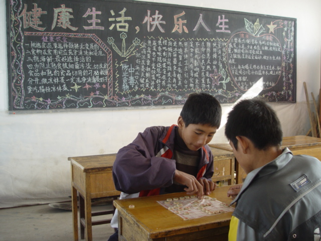 同时,我们七(二)班的同学们的业余爱好也很广泛,其中一部分同学很爱下象棋。瞧!说着说着又有两位同学准备"杀"两盘了,看他们的神情和架势,仿佛谁都抱着必胜的信心。再看后面的黑板报,看上去给人一种舒服的感觉,这可都是我们黑板报组人员的结晶呀!