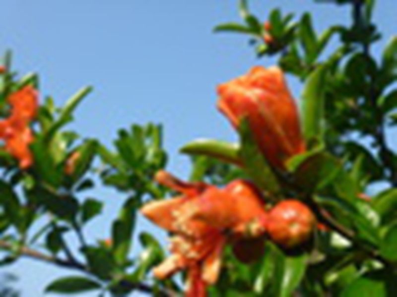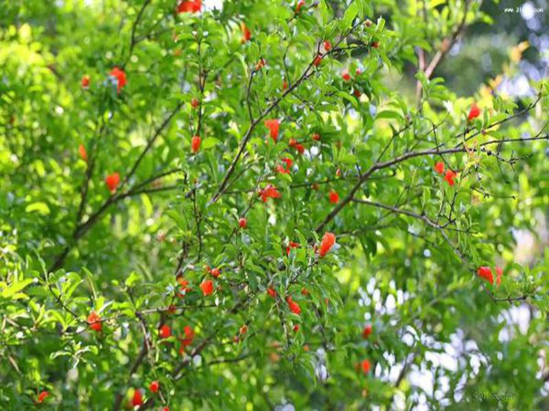 夏天来了,石榴树上的花骨朵儿绽放了,石榴花火红火红的,美丽极了。石榴树上的花儿多得数不清,远远望去,像点点星火。碧绿的石榴树,红嫩的花朵,形成了一幅绝妙的风景画。