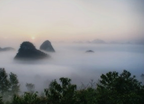 天蒙蒙亮,雾黑色的一片,像一张硕大的天幕,遮掩住了我前进的道路,前不着路后面没有人,让我有点不知所措。