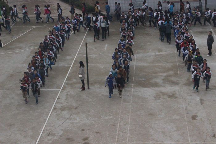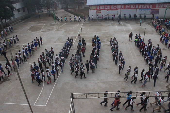 顷刻间,教室的同学纷纷冲向了操场。那些九年级、七年级的学生,也陆陆续续来到操场,一切准备完毕。体育老师放起了跑步音乐,同学们踏着音乐的节拍,在各班划定的区域中跑步。尽管中间有人“作怪”,但总体还是十分整齐,生机勃勃。跑步结束,是感恩手语操,同志也是活力四射,无不体现中小学生充满活力,蓬勃向上。