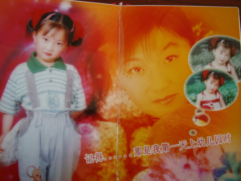 再看这张,那是我刚上幼儿园时照的,我穿着校服,拿着一个凉帽,梳着两根小辨,笑得是那么甜,这充分表面我在幼儿园是多么的快乐,简直是一只快乐的百灵鸟。再看右边的小相,在泡泡中呈现了我的淘气和可爱。上面还写着:"记得……那是我第一天上幼儿园时"。这几个大字,它引起了我对幼儿生活的留恋。