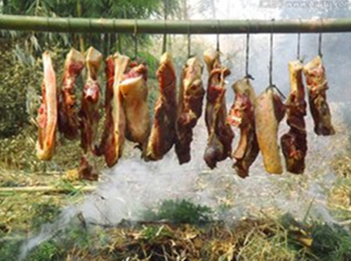 然后就可以熏肉了,但熏制是最讲究的。不能用的柴禾:1、不能用煤,煤烟使肉酸而糟味怪。2、不能用马尾松(枞树)包括松针,松烟油使腊肉不好洗,其肉味涩;3、不用桐子树、木梓树,桐子味辣,木梓褪油。4、忌塑料等一切有毒有异味的柴禾。最好的是:香柏枝叶,柑橘橙柚的皮,花椒胡椒,辣椒茎杆,红薯藤等。火势不宜过猛而又不间断。这样,色、香、味具成上品,达到温补而健美的效果。