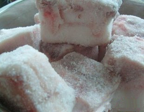 其次,将不肥不瘦的肉切成大约三斤重一块,将每一块抹上足量的盐(喜欢吃辣的可以抹点辣椒粉),再将抹好盐的肉叠放在一起放上一周左右让肉入盐。