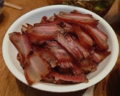 最后,储藏。熏制好的腊肉宜晾挂在阴凉通风处,不可曝晒。仓储的话,可用谷壳层压,防肉虫。这样,一块块金黄的腊肉就产生了,你也可以自己动手试试看。