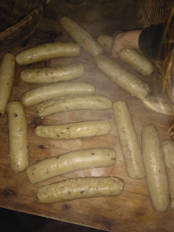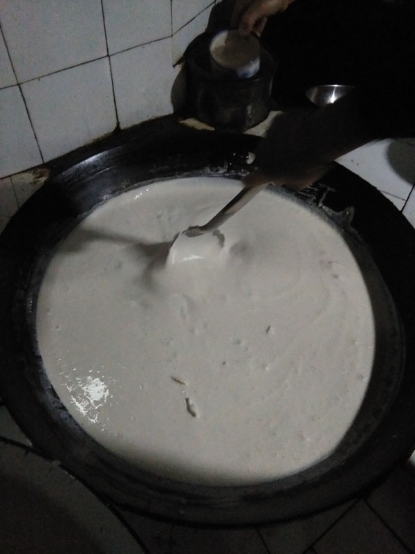 将磨好的米浆与豆浆倒入大锅中煮。差不多的时候改小火,一定要边煮边搅,不然不行。待煮熟后成为米糊时,倒入容器内,冷却后才能吃。