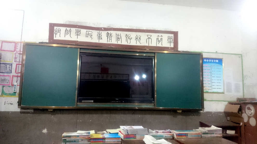 一走进我们的教室,首先你会看到我们的桌子板凳摆放得整整齐齐,地上一层不染,再看向讲台,你会发现我们的黑板干干净净地立在那里,安静地等待着老师们的抚摸。黑板正中央还有我们新的教学设备——电子白板,它可是爱心人士对我们的捐赠,我们格外爱护。