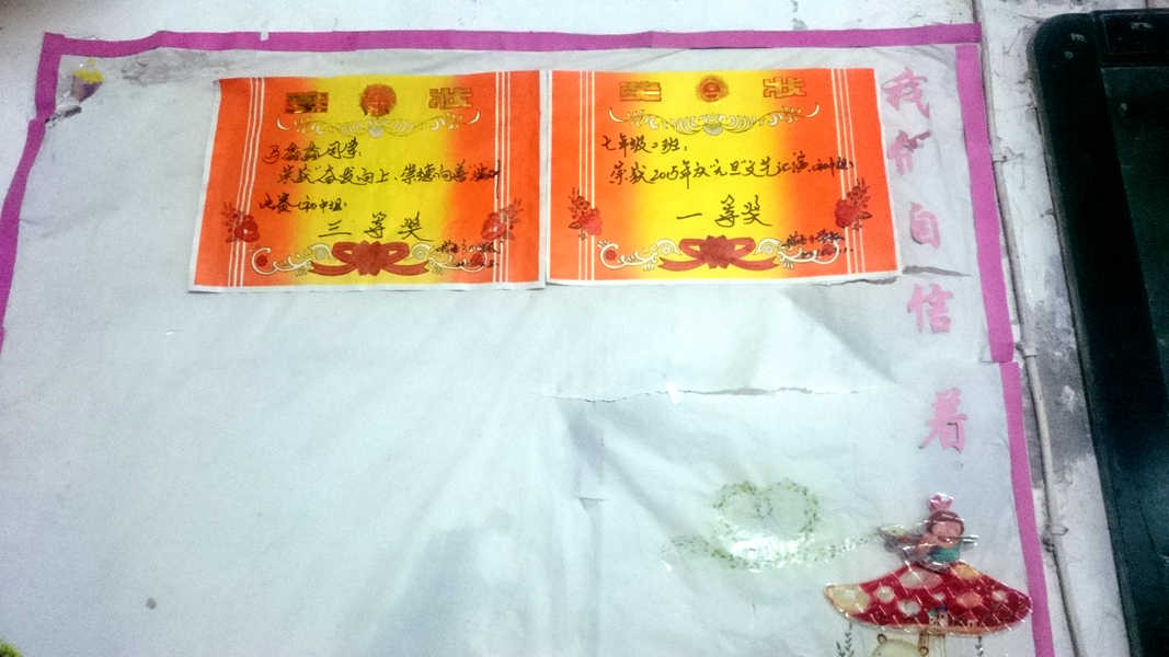 教室的左右墙壁上贴满了名人名言,比如"书籍是人类进步的阶梯——高尔基"、"我们应该要有恒心,尤其要有自信心——居里夫人"……虽然这样的布置很普通很简洁,但却给我们这些读书的孩子一种神圣的感觉。
