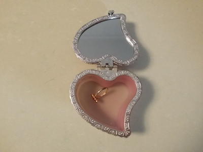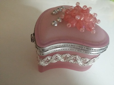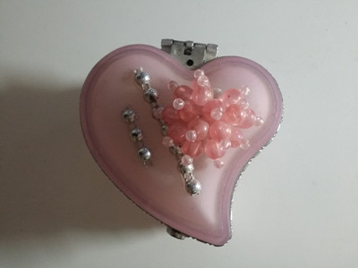 这个八音盒还有一个特点,那就是可以存放东西。仔细瞧一瞧,爱心是一个盖子,可以打开将自己喜欢的小物件放在里面。八音盒不仅外部特点多,内部也很特别,还有一面镜子。这件工艺品真是别具一格,我非常喜欢它。