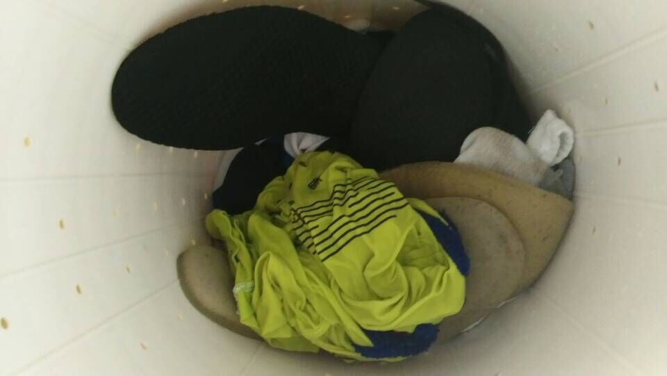 等洗衣机停下来,把洗干净的衣服捞出来,然后再涮上几次,直到看不见洗衣服的泡沫为止。涮干净之后,把衣服放在甩桶里一甩,衣服就干了一半,这时把衣服再晾出去,强烈的阳光一会儿就把衣服晒干了。