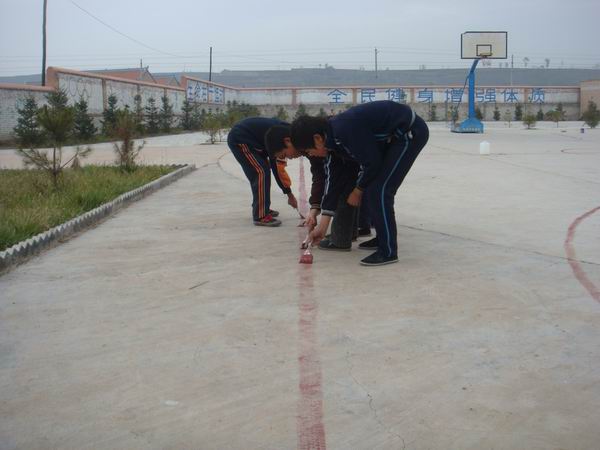 马上要开篮球运动会了,同学们都高兴坏了,看见操场我们同学都甭提多兴奋了。然而我们的操场是去年画的线,现在已经看不清楚了,体育课剩余10分钟了,徐老师带领我们开始画线了。