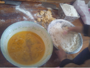 早上刚吃完早饭,就被老妈拉过去帮忙,开始挺好奇的,在一旁看老妈准备原材料。妈妈先取了二十只鸡蛋打入大盆中,搅拌均匀,再将早就放在炉子上融化好的猪油倒了进去,加入一定量的冰糖水。使其酥脆可口,甜而不腻。再将事先和好的加入少量水的面粉慢慢倒入,边倒边用手搅拌使之均匀。放入了这么多好东西吃起来肯定很香吧!"我情不自禁的想。 把揉好的面条放入盆子里盖好,让它自然发酵,待过了二十分钟将面条取出用擀面杖擀成长条,在其表面涂抹上植物油,这样能使面条不会粘在一起而变形。再用菜刀切成一个个长条。接下来搓麻花这个重要的任务就交给我了,妈妈给我找了个大盘子就去忙别的事情去了。搓麻花的时候要将面搓成圆润的长条,不能太细不然麻花还未成形面就已经断掉,这样才能使麻花胖乎乎的看上去很可爱。奈何数量太多,让我忙活了大半天,终于完成了老妈交待的任务,累的腰酸背痛的,可是心里别提有多高兴了,这可是我期待已久的呢!