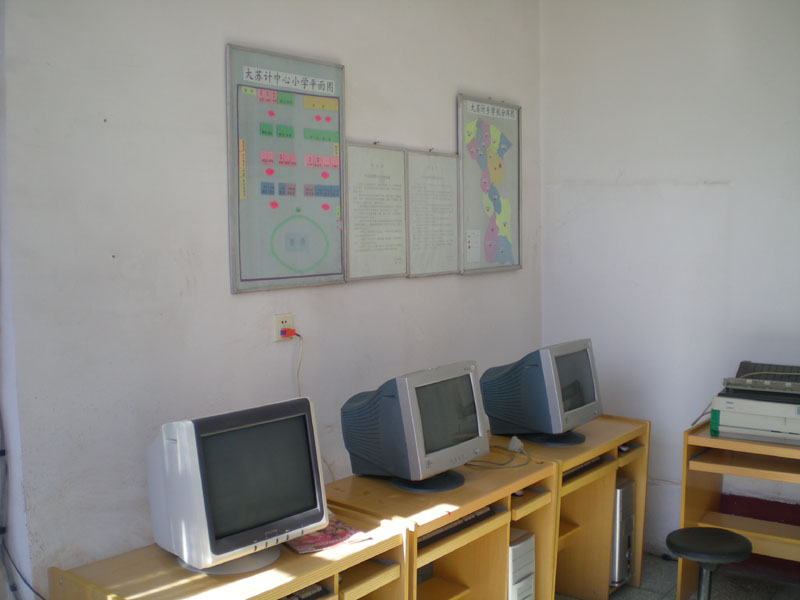 这一排都是教师用的电脑,每一台电脑都联了网,老师在这儿备课,查资料,有时候我们也可以来查点儿学习的资料,不过得经过老师的允许。