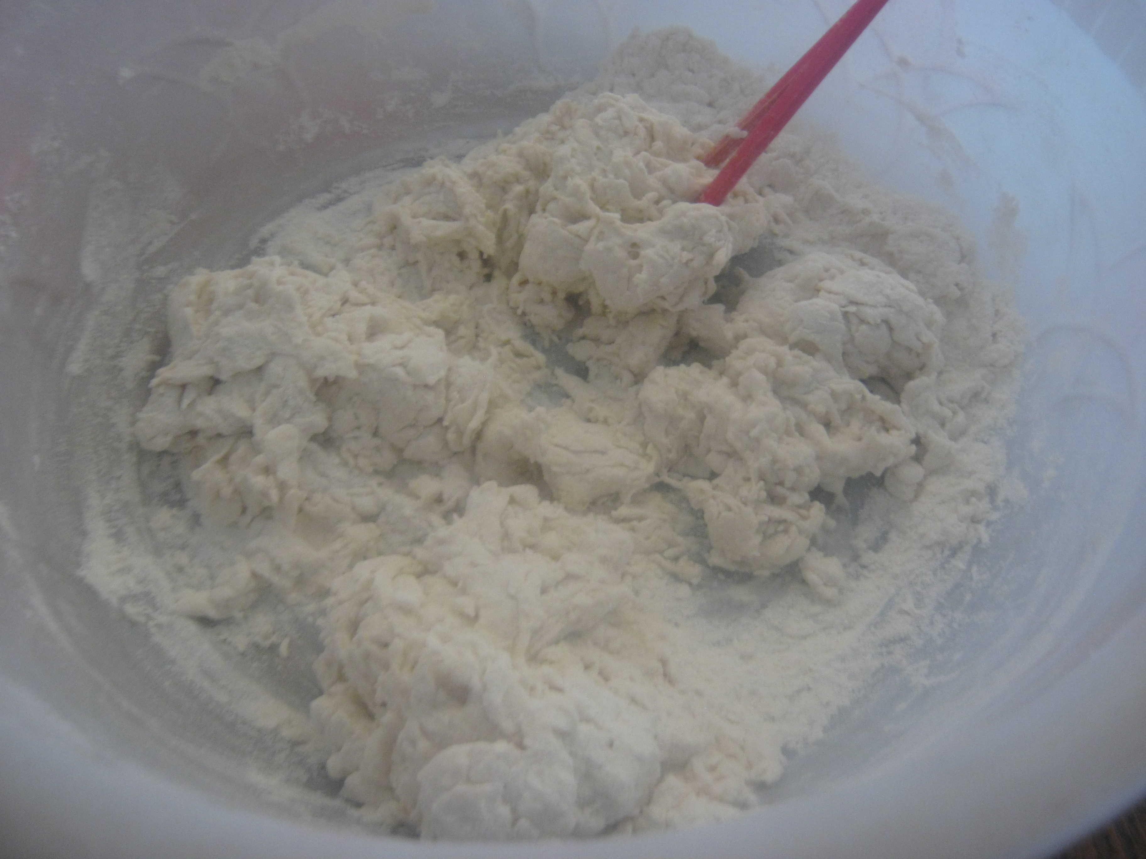 开始做时,首先在面盆里放上一碗或者两碗面粉,面粉的多少可以根据吃的人的多少来看的。放上面粉以后,就用温水来和面,拿上一副筷子,边倒水变用筷子搅面,水不能多也不能少,如果水多了就成面汤了,水少了面就太硬了,人吃了不易消化,当水适中的时候,搅的面又均匀又软乎。