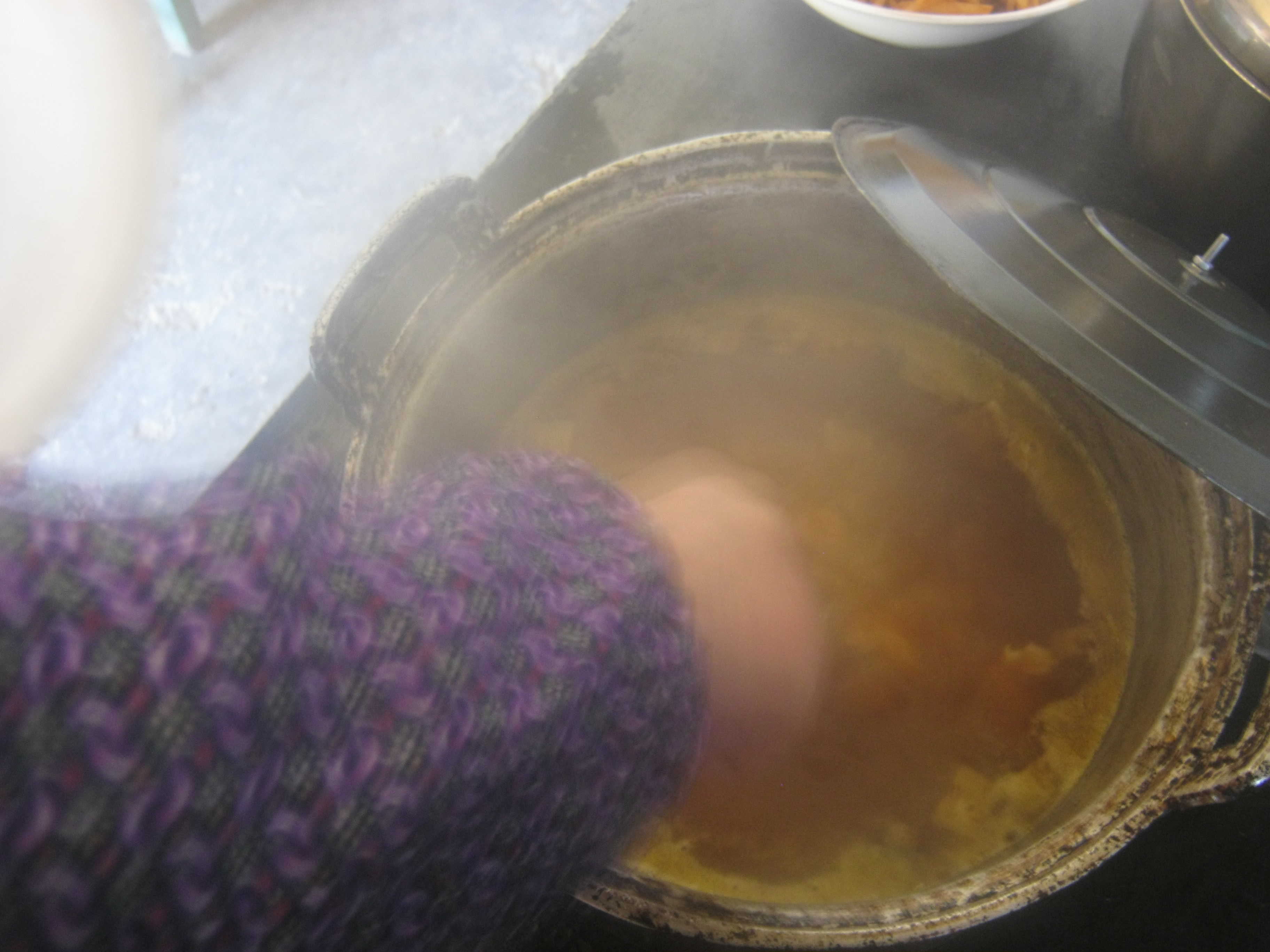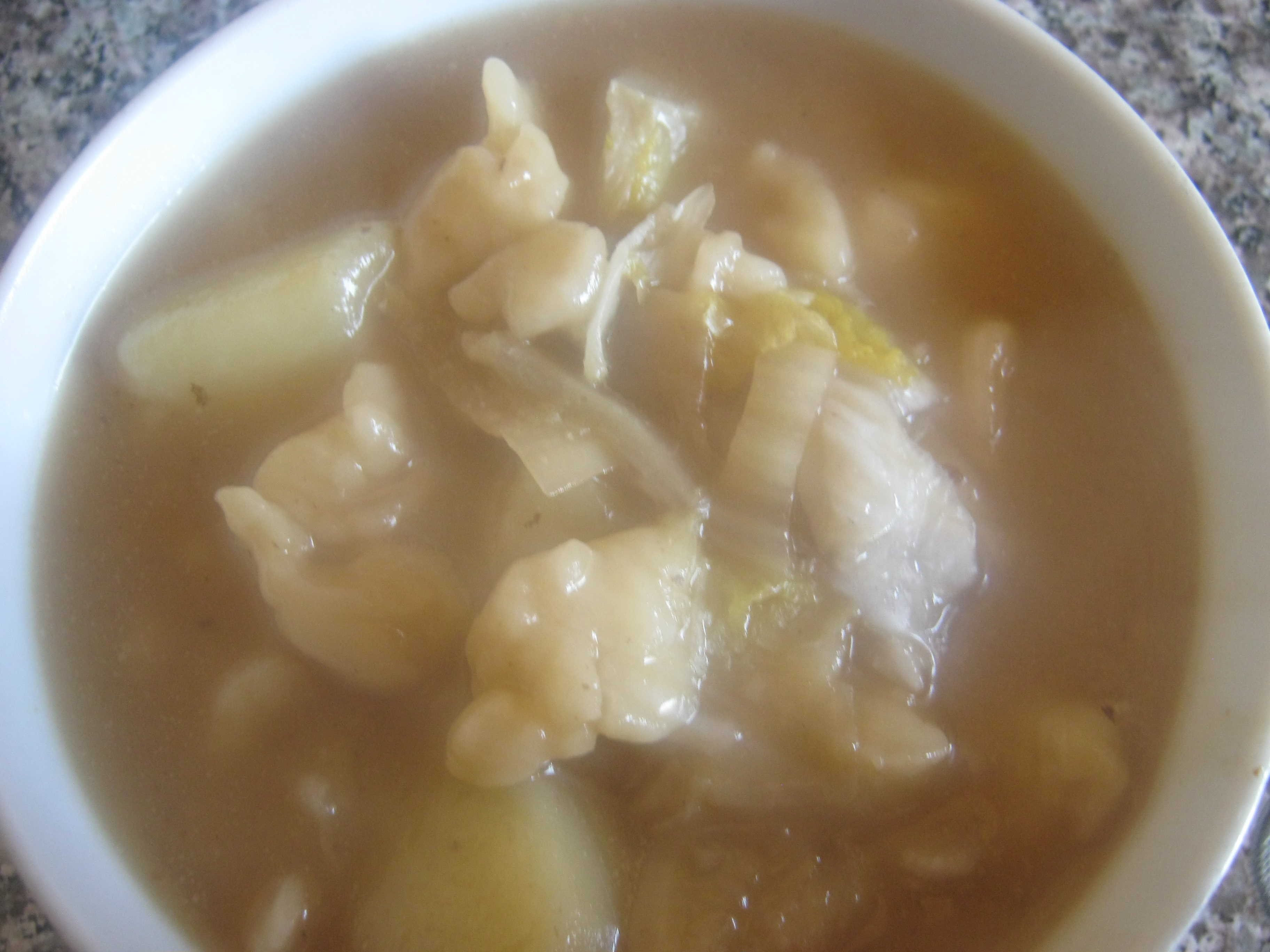 搅好面后,第二步就是往锅里倒水,当水沸腾时,把土豆洗净削掉皮后,再切成小方块放进锅里,等土豆快熟时,就把油菜和自家做的酸菜放进去,等菜们熟了,就可以用筷子把和好的面一勺子一勺子的抄进屋,抄的面团不能太大,尽量抄的小一点,而且抄的面团一定是均匀的,要不然的话大小不一,导致的结果就是有的熟了有的没熟。这可是一个费力的活,抄的时候常常导致我的胳膊和手腕又酸又疼的。