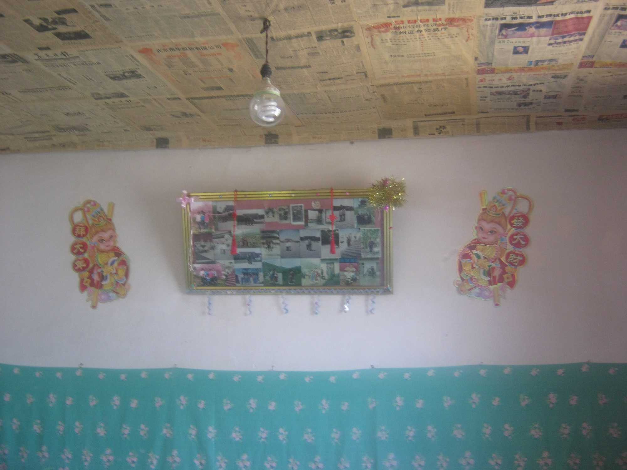 我们的大房子一步迈进去,首先进入眼帘的是一张大大的桌子,桌子上面的镜子下压着许许多多的相片,有弟弟的,我的和我们的全家福。然后往右有一个大炕,炕后面的墙上挂着一个大相框,里面是爷爷奶奶的照片,相框的旁边有两个猴子,猴子上写的是:拜大年,发大财。炕的前面还有一个液晶,这是爸爸买给我和弟弟看的。