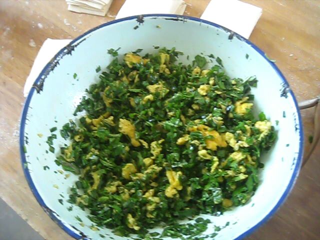首先,将菜馅做好。将鸡蛋打碎一炒,再把韭菜洗好一切,然后把它们两个搅到一块,放上调料搅匀就好了。
