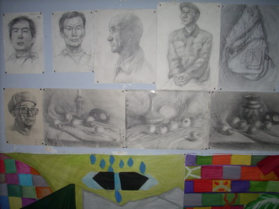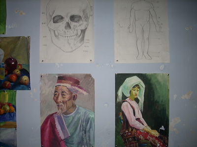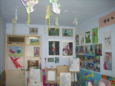 画室的四周墙壁上都张贴着学生的作品,随着时间流逝,学长学姐们陆续都走了,但他们的作品却仍然留在这里。他们走时把自己的画板、水彩笔等统统留给学第学妹们。画室里永远充满温馨,画室里的故事就这样一直延续下去。