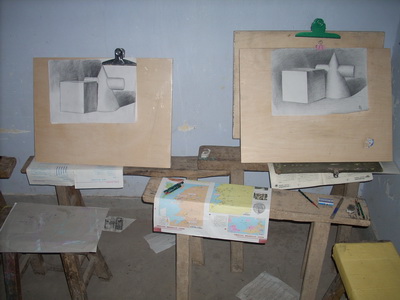 画室里摆放着一些绘画模型,例如各种几何石膏形体、每一名学生都有一个画板,都有自己的水粉和彩笔。画室里的条件虽然比较简陋,但我们在这里感到很安静,很适合我们学习。