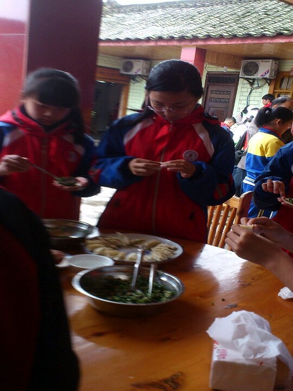 所有饺子包好后,老师带着我们回教室上课,诵读弟子规,学习圣贤之道。第一节课下课后饺子和菜就准备好了,大家依次来到自己的小组吃饺子了。饭吃完后,志愿者们还选了几名同学来帮着洗碗。