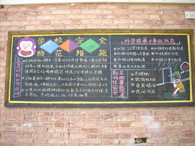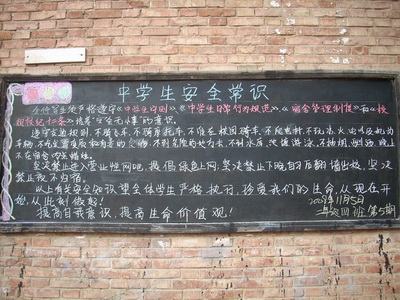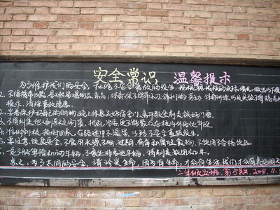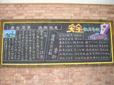 自从学校安排这项工作之后,各班学生展现了极大的热情,经过一星期的努力,刊出了一期形式多样、内容丰富的高质量黑板报。各个班级的黑板报主题鲜明、图文并茂,内容详实,从各个方面、各个角度介绍了交通安全、防火安全、食品卫生安全、日常行为安全、心理健康安全、校内外集体活动的安全防范工作、冬季传染病预防等内容。