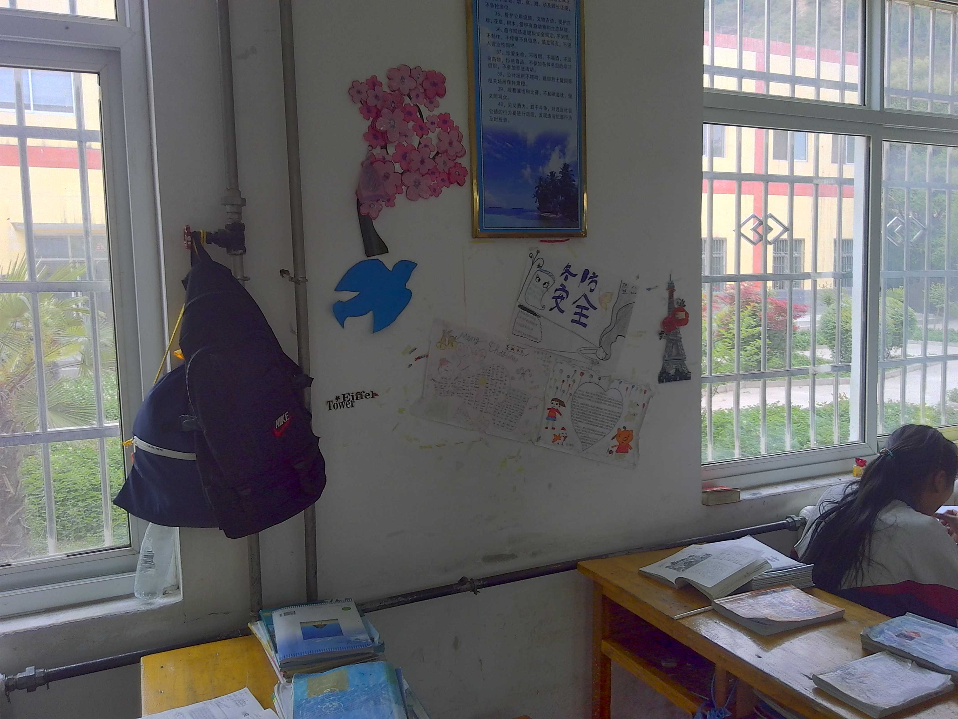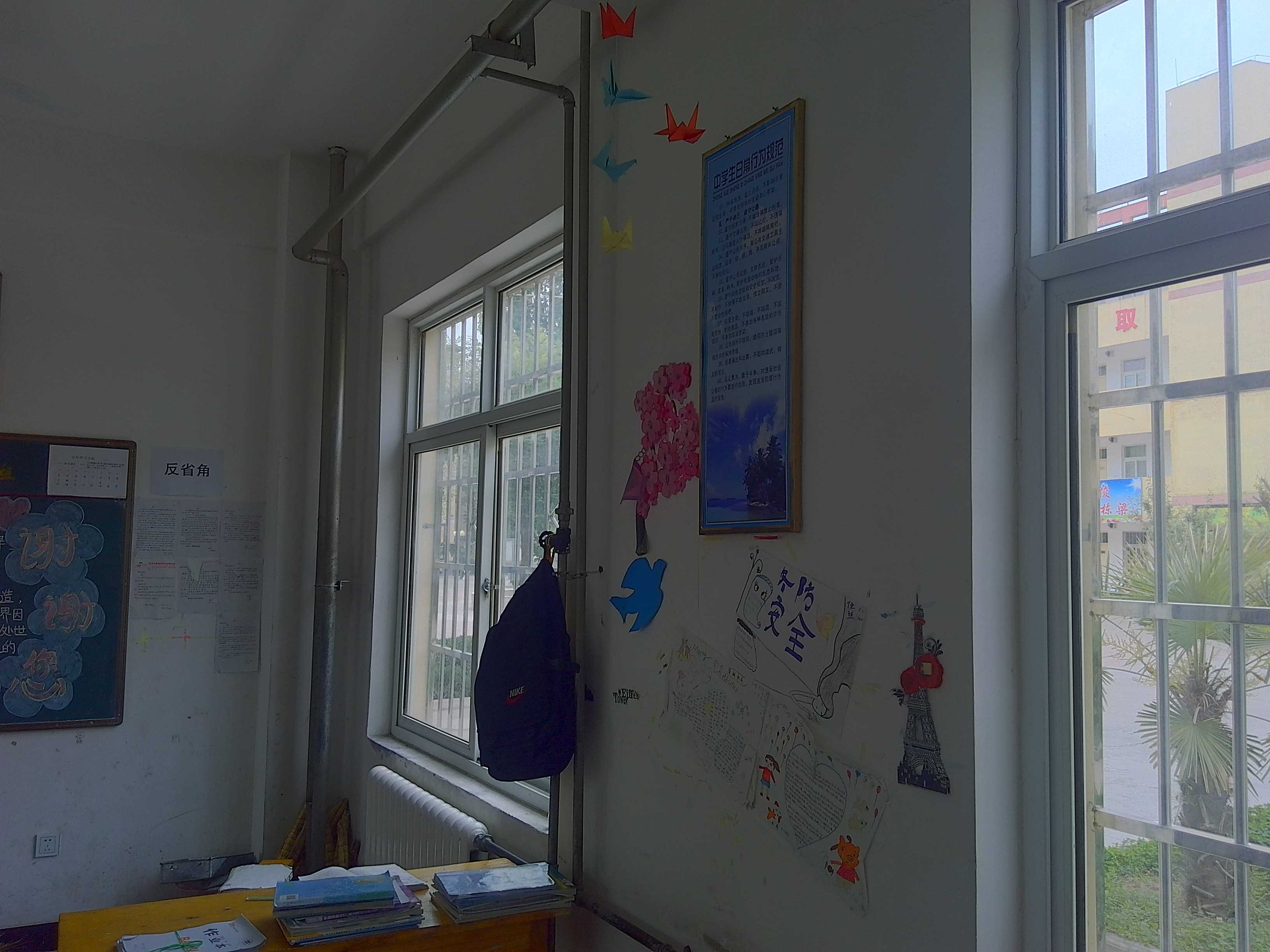 我们八二班,在学校永旺教学一楼,在我们的教师里,有四排桌子,中间的桌子拼在一起,两边与墙挨在一起,两边各一条过道。前面有一个讲桌,还有电子白板,后面也有一个黑板,供我们办黑板报和抄写学科题目。教室墙很洁白,上面贴有我们制办的手抄报,而在前门边的墙上,还有我们班的微笑墙,本来要设计成心形的,但贴出来的根本不像,老师问我们贴的是什么形状,我们说是新型的,老师说不像,最后我们改了个随意点的。整个感觉就好像我们的家一样温馨。
