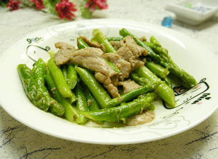 芦笋可以炒肉,还可以素炒、炖汤、凉拌等,基本上可以和能吃的菜合炒吧!而且它还是一种"良药"呢,经常食用可消除疲劳,降低血压,改善心血管功能,增进食欲,提高机体代谢能力,提高免疫力,是一种高营养的保健蔬菜。