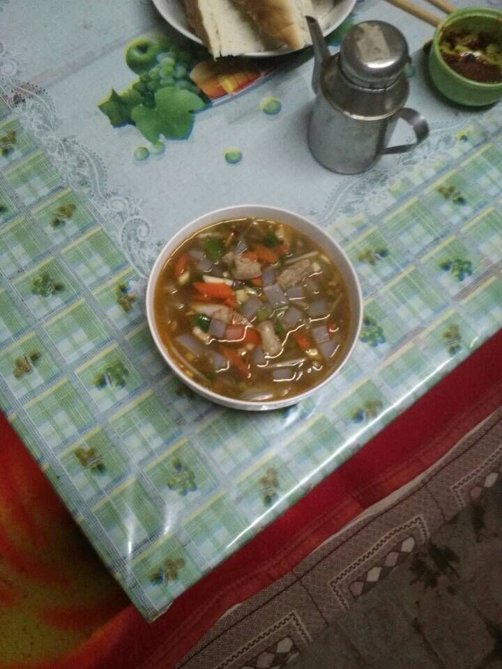 首先,弄好一些粉,切成豆腐块的形状,再找上其他的一些蔬菜,例如:胡萝卜、青菜、以及土豆之类的。接着,就是熬汤了,熬上大约半个小时应该就好了。最后,就可以出锅了。粉汤大多是在过重大事情的时候招待客人的,做成后的粉汤和鸡蛋汤相似,但是,我还是喜欢粉汤。