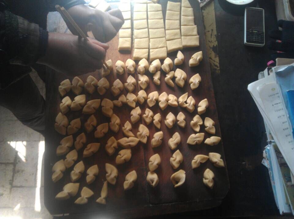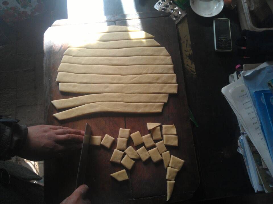 接下来,将面饼切成一个一个小方块,然后用筷子夹一个美丽的图案,如:翩飞的蝴蝶、美丽的鸟……最后,将这些面图案放进滚烫的油锅中,炸成一个个蛋黄色的小面块,这就是——油锅。