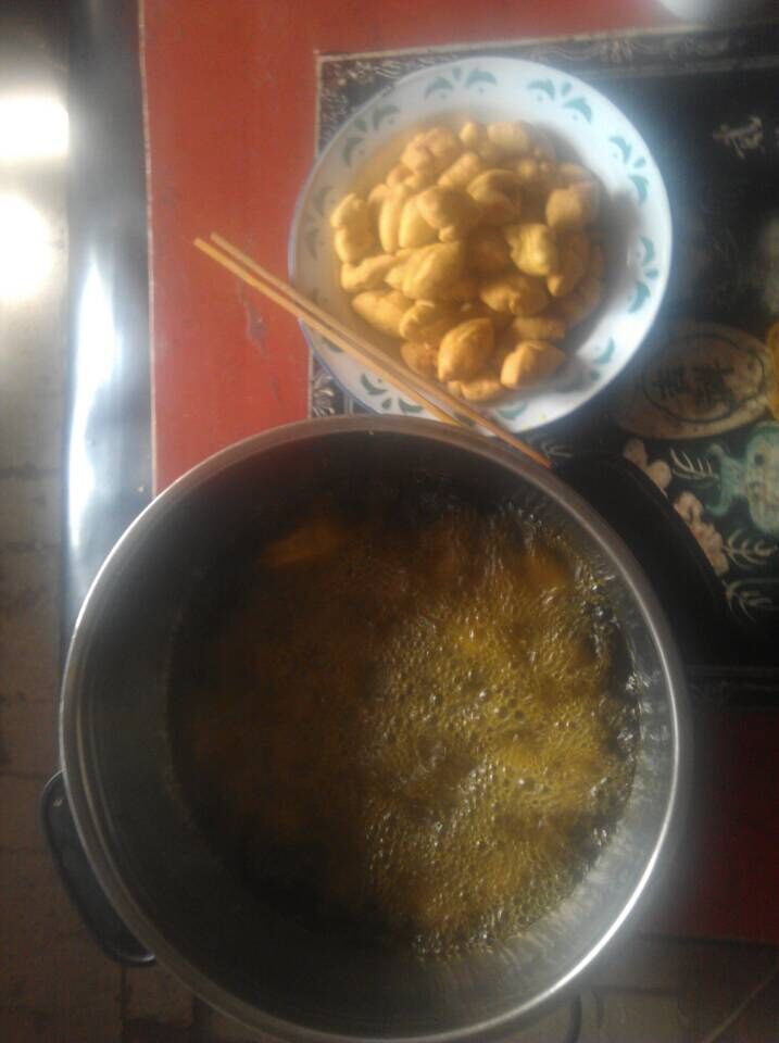 油锅是家乡的著名小吃,但做油锅可有一个漫长的过程。首先,用白砂糖、蜂蜜和清油来调和一碗美味的水(水一定要让糖融化,不能发生沉淀)。同时要准备好一盆发酵好的面,用和成的水来揉已经发酵好的面。