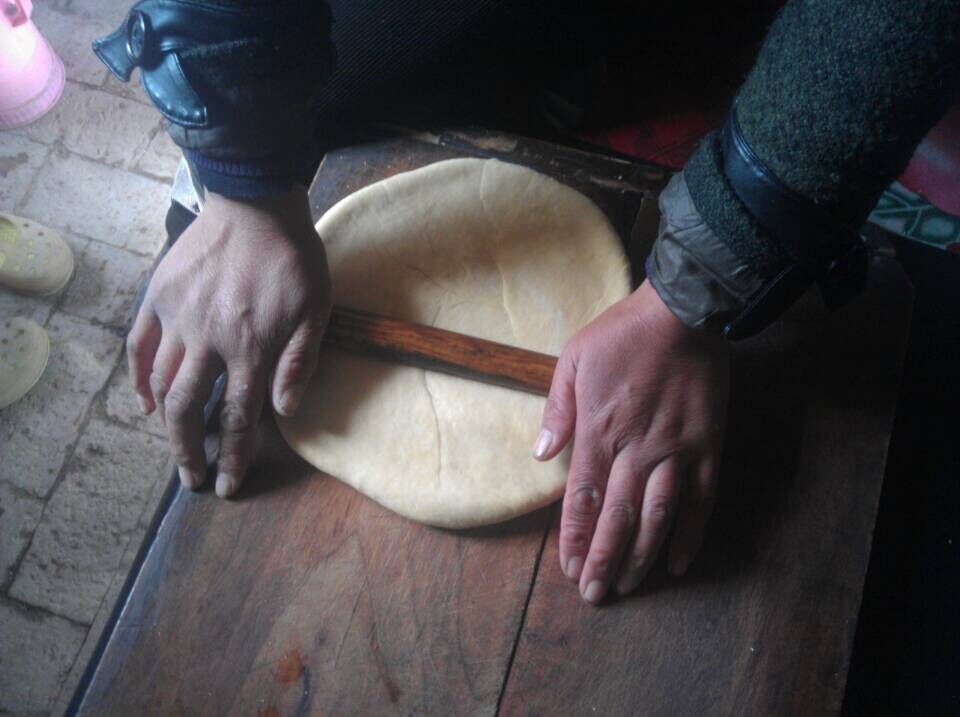 揉面时,要多用劲,正反面翻着揉,揉成一个面团。揉好面后,将面团擀成一个面饼,要反复多次的擀,才能使面饼有劲道。最后一直擀到成为一个薄薄的,较软的面饼即可。