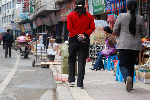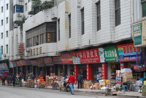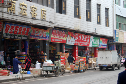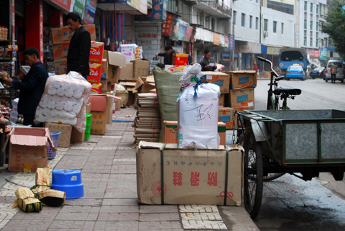 出现这种情况地方大多是些农贸市场,或者是批发市场,由于货物太多,铺面面积小,商户没有办法就只有摆在街上卖。但我认为,这不是理由,这样既影响城市的美观,又给行人造成不便。