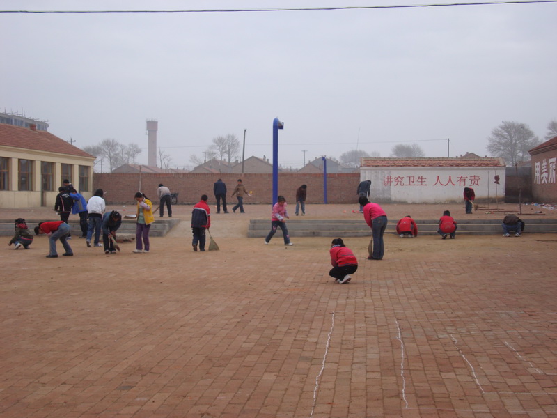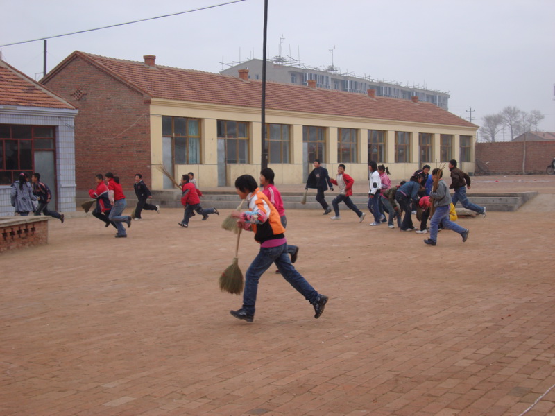 离晨读课还早,于是各班便打扫起环境区来。由于"校园环保者们"的出现,于是整个校园便热闹起来。每一把扫帚都变成了校园这个大舞台上的主角儿。在校园中的每一个角落都会有扫帚手舞足蹈的镜头。凡是扫帚"跳过舞"的地方,灰尘就会消失,就会出现一块块鲜红的砖。