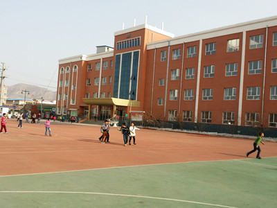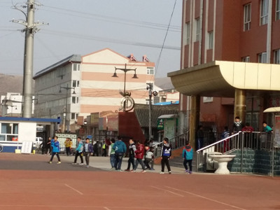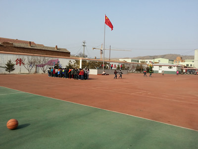 在操场的中间,有一座蓝色的演讲台。登上演讲台,向后看,墙上刻着字:"我自信,我阳光,我健康。"在演讲台的前面,有一面高高升起的五星红旗,随风飘扬。在五星红旗的前面,是一座高大的教学楼。教学楼一共有四层。在一楼,有赤城县第一小学的简历,二楼有画展,三楼有书法作品,四楼有学校获得的荣誉。每一间教室都十分明亮,十分宽敞,每一个楼层都挂着古诗、名人名言。