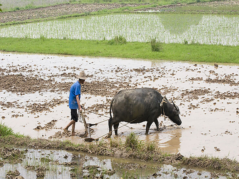 收完水后就要忙着更田了,于是在家里"休息"了大半年的大水牛终于该它上场了,爷爷将大水牛牵出来然后给他喂饱食就把它干下水干活了。