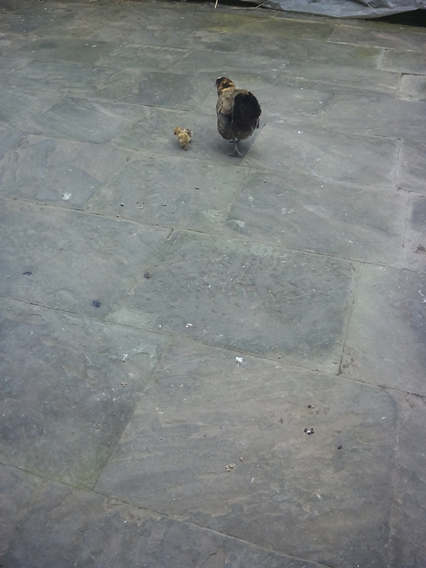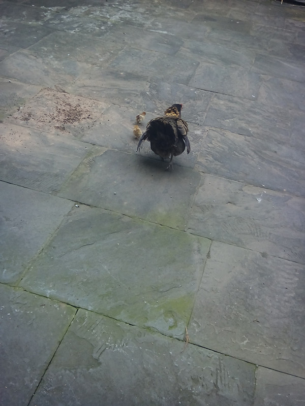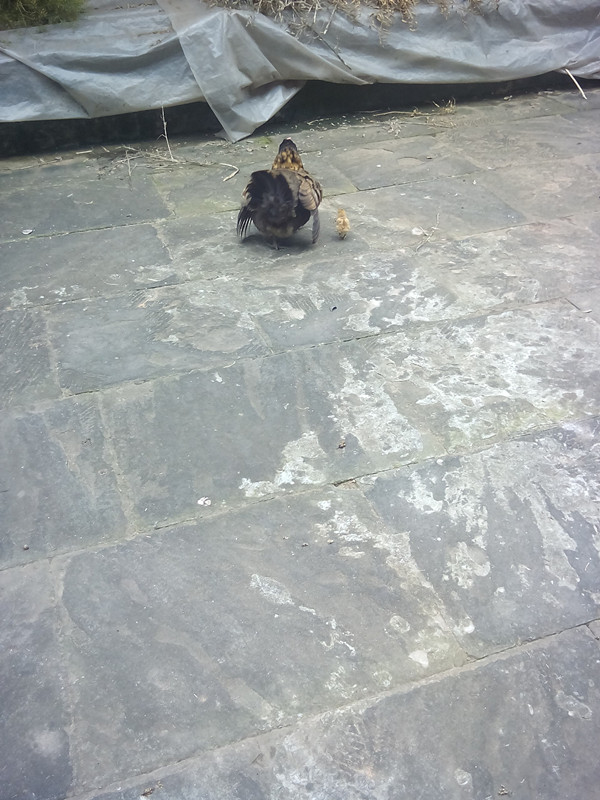 早晨,还在睡梦中的我被"叽叽、叽叽"的声音吵醒了。原来是我家的老母鸡带着那一群刚刚孵出不久、只会叽叽喳喳乱叫的可爱小鸡出来溜达了。小鸡们的身上长着金黄色的绒毛,活像一个个小小的金黄色绒球。可爱极了。
